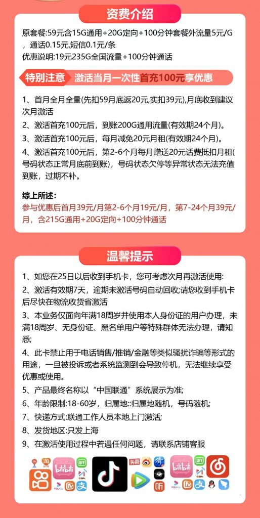 流量大户看过来!只需19元,你就能获得235G超大流量和100分钟通话时间!这优惠只在【联通小沪卡】,只发上海哦!激活后记得首充100元,月租优惠才能到手!别错过这个超值套餐!