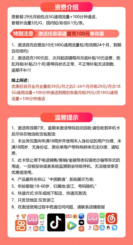 联通元凤卡(浙江专属):29 元 150G 通用流量 + 100 分钟通话详情 一、核心套餐内容 项目 详情 月租 29 元 / 月(第 2-24 个月优惠价),首月及 25 个月起恢复39 元 / 月(自动续约) 流量 150GB