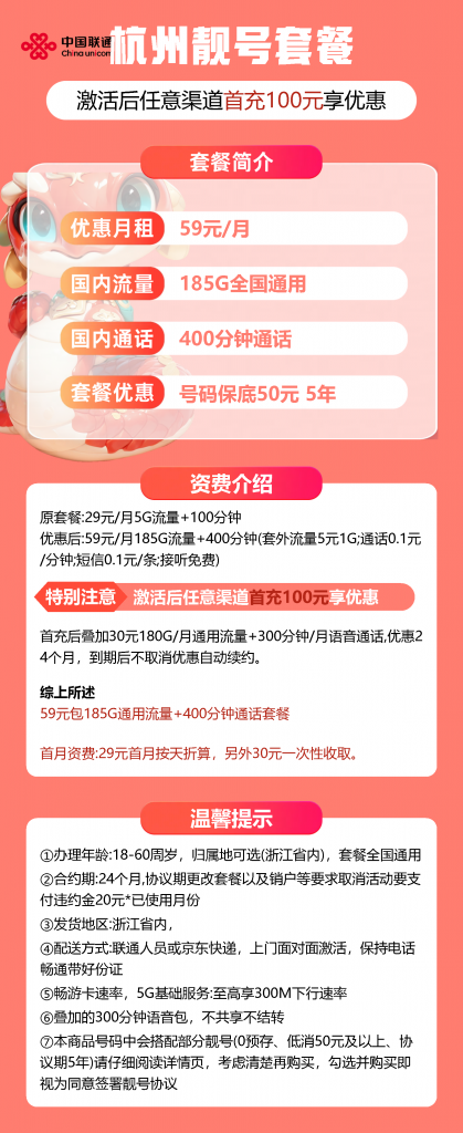 浙江的朋友们注意啦!中国联通推出超值大流量电话卡——浙江靓号畅游王卡(59元185G版),让你畅享高速上网体验。