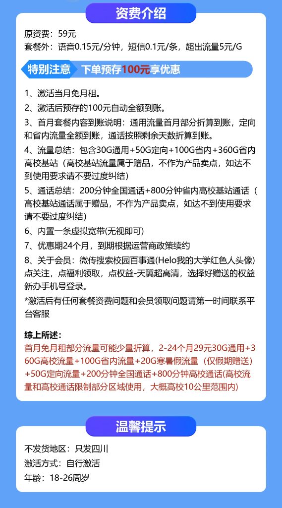 亲爱的朋友们,抓住机会,体验中国电信四川专属行运卡的超值优惠!仅需29元,您就能获得180g流量+200分钟通话时长+一年视频会员+首月免费等多重权益。📱🕒 这不仅仅是一张电话卡,更是你生活品质的提升!