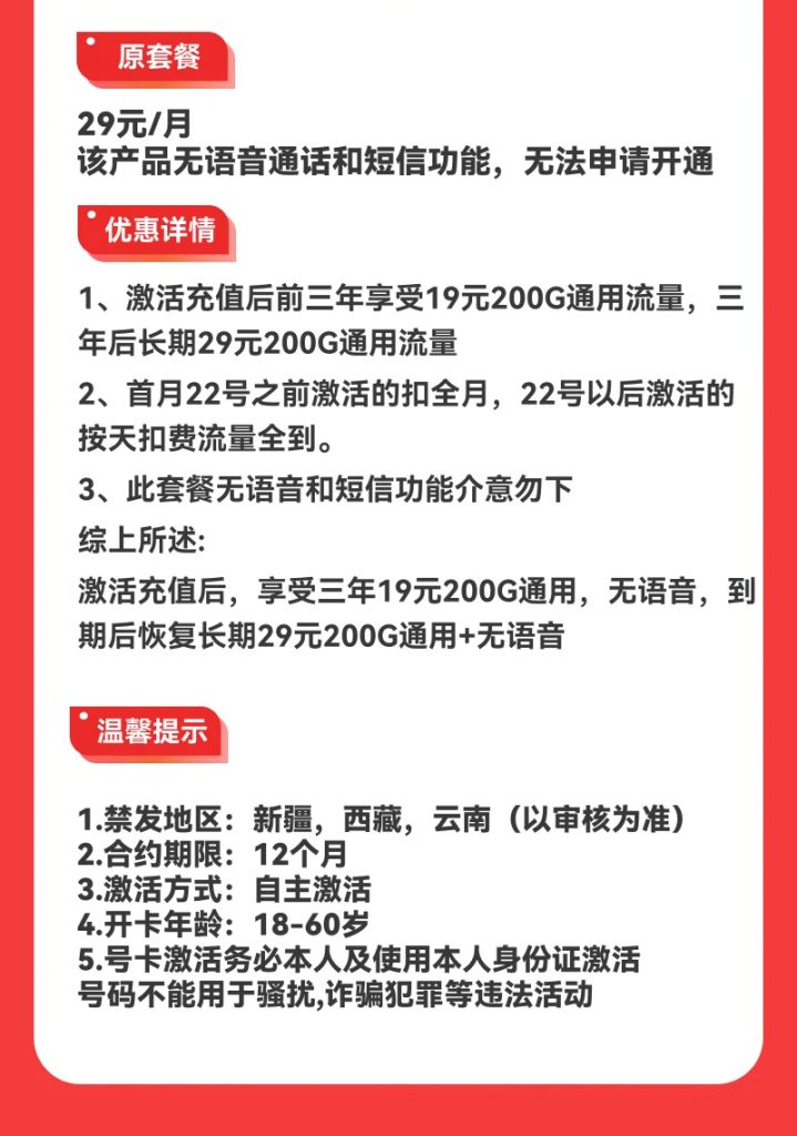 【联通乾坤卡】19元200G流量,畅享全国无语音!